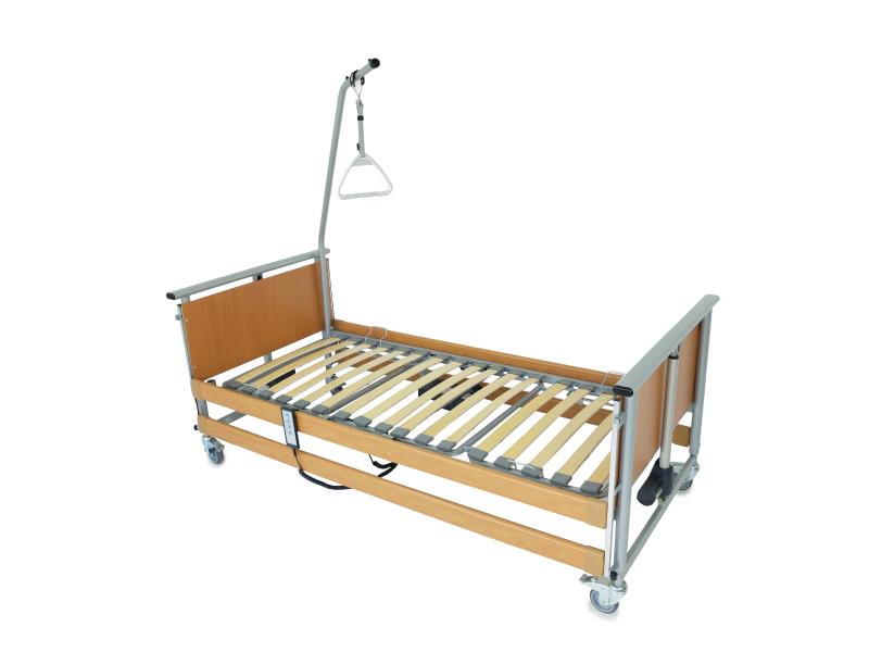 Le lit est équipé de panneaux tête et pieds avec colonnes métalliques télescopiques motorisées, garantissant une grande stabilité. Le sommier à lattes en bois assure un confort optimal, tandis que les barrières coulissantes en bois offrent une sécurité renforcée. La potence en époxy Silver ainsi que le panneau de finition en mélaminé hêtre dissimulant les moteurs côté patient apportent une touche esthétique à ce lit fonctionnel. Il est livré avec un kit de transport et un montage facile, sans outil.
